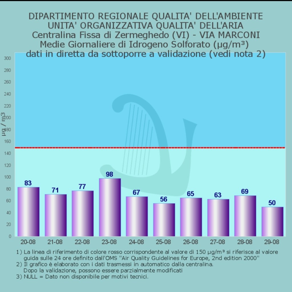 Dalla ripresa della produzione post lockdown 2020, la centralina in zona industriale (costo 40.000 euro, metà da parte del Comune e metà da parte della Provincia) ha sempre registrato (eccezion fatta per un paio di episodi) medie giornaliere di idrogeno solforato al di sotto del valore guida di 150 microgrammi per metro cubo d’aria indicato dall’OMS. Il trend si è confermato nell’ultima decade di agosto, quando è stato registrato un valore massimo di 98 microgrammi per metro cubo.