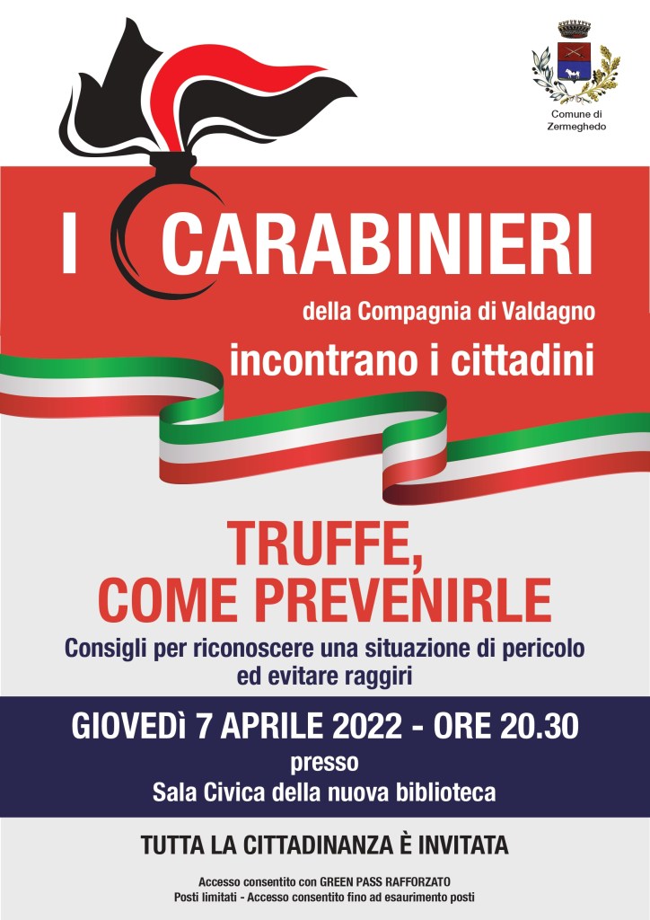 Nel corso dell’evento, in programma giovedì 7 aprile 2022 alle 20,30 nella Sala Civica della nuova biblioteca, il Comandante della Compagnia Carabinieri di Valdagno, Cap. Danilo Ciampini, fornirà consigli per riconoscere le situazioni di pericolo ed evitare i raggiri.