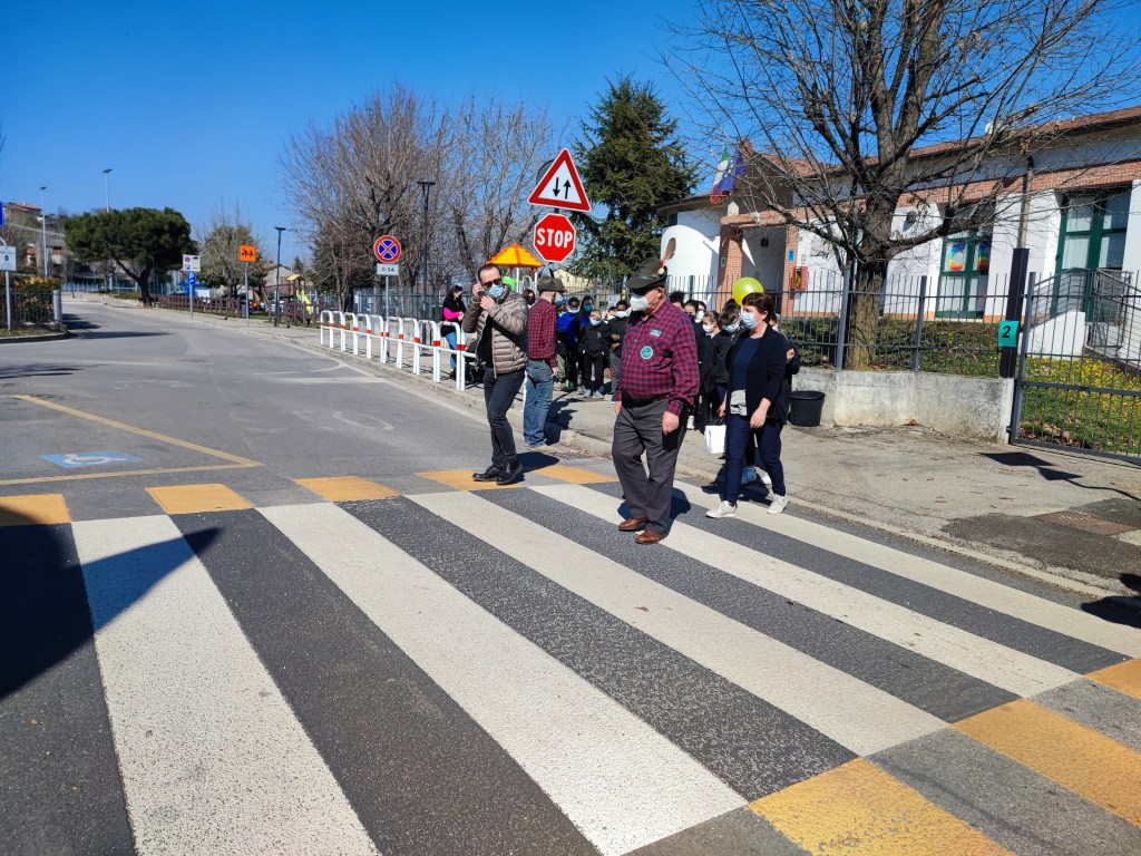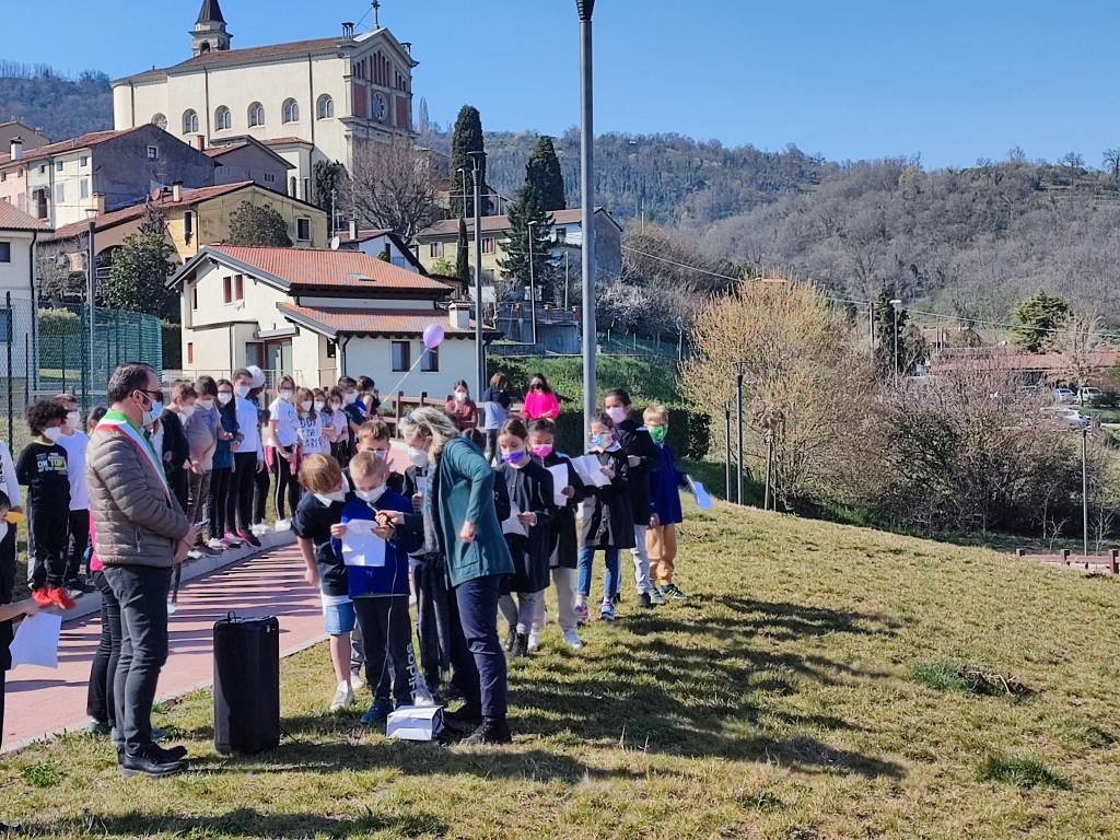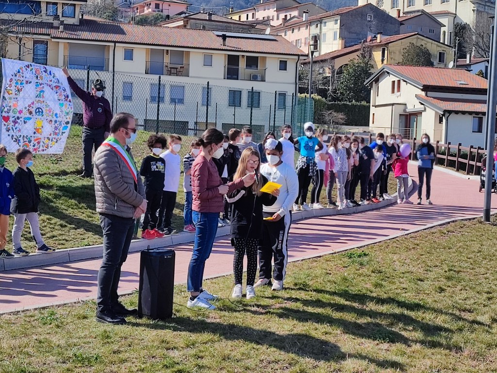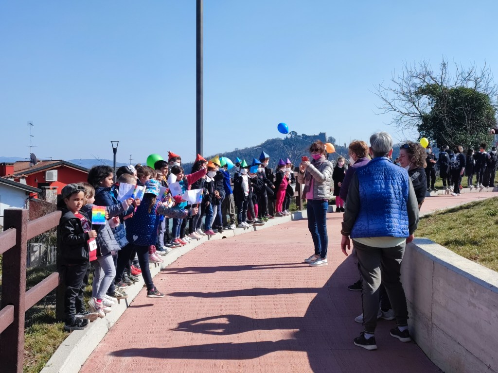 Oggi pomeriggio gli alunni della scuola primaria e dell’ultimo anno della scuola dell’infanzia sono stati i protagonisti di una colorata manifestazione, che ha visto anche la partecipazione del sindaco Luca Albiero, della consigliera comunale Sofia Elena Russo (incaricata a seguire le tematiche scolastiche) e di alcuni rappresentanti del gruppo degli Alpini.