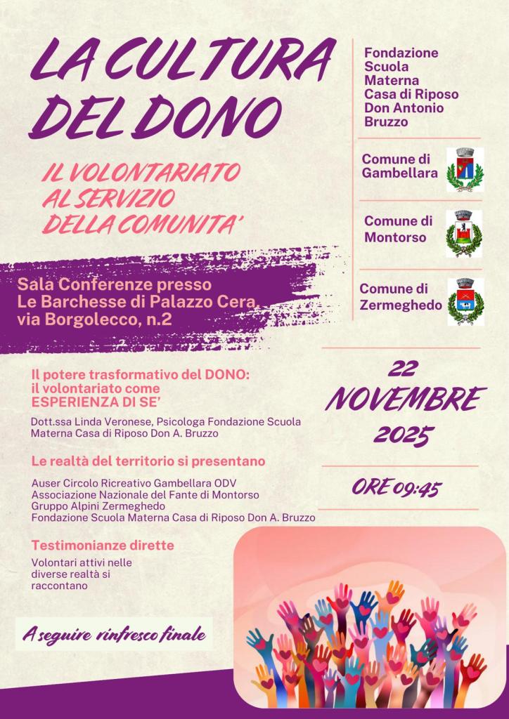 Il Gruppo Alpini di Zermeghedo sarà tra i testimonial dell’incontro pubblico “La cultura del dono – Il volontariato al servizio della comunità”, in programma il 22 novembre alle 9.45 nella sala conferenze presso “Le barchesse” di Palazzo Cera, in via Borgolecco 2 a Gambellara.